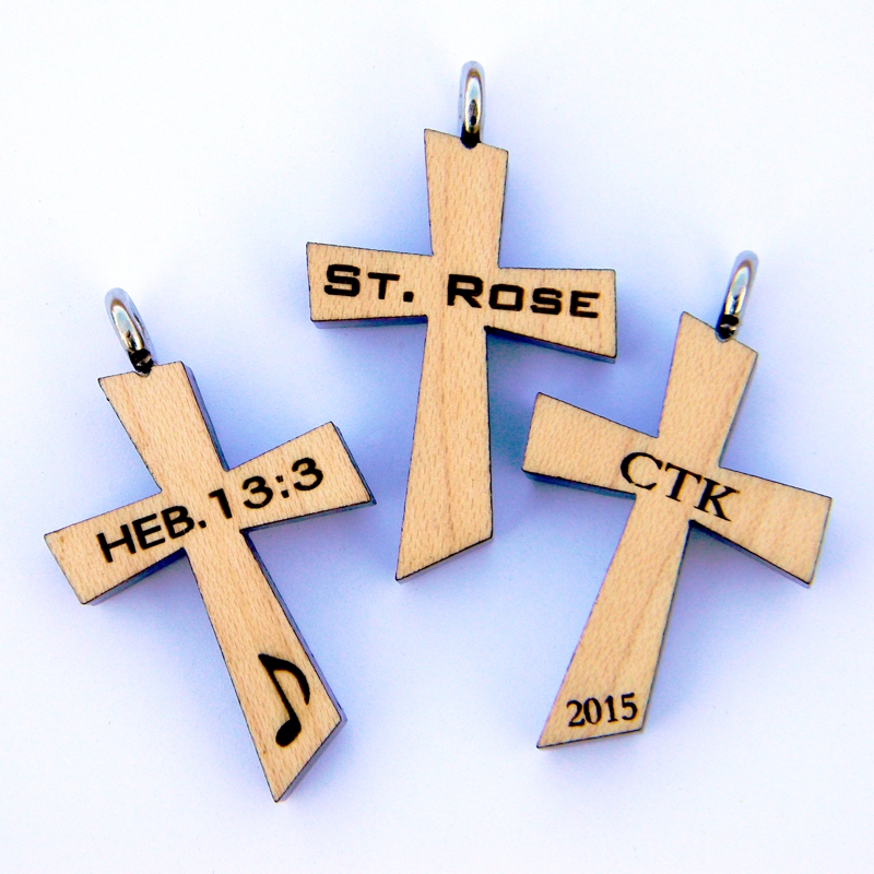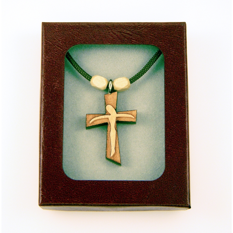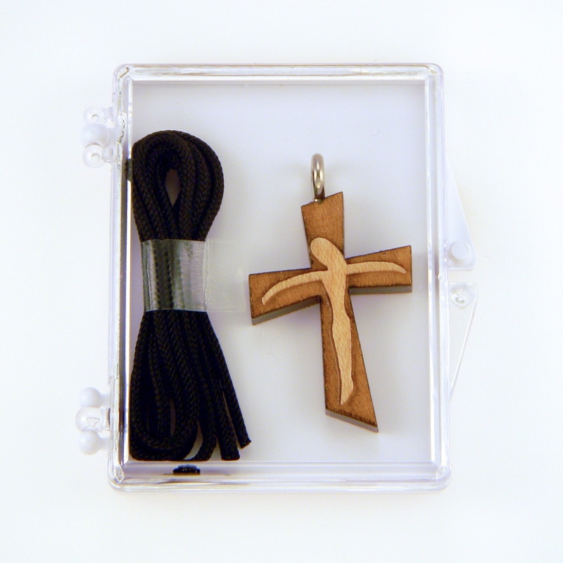 Gravée et taillée au laser, cette petite croix en relief et sur laquelle est figuré Jésus crucifié est fabriquée en bois d’érable.