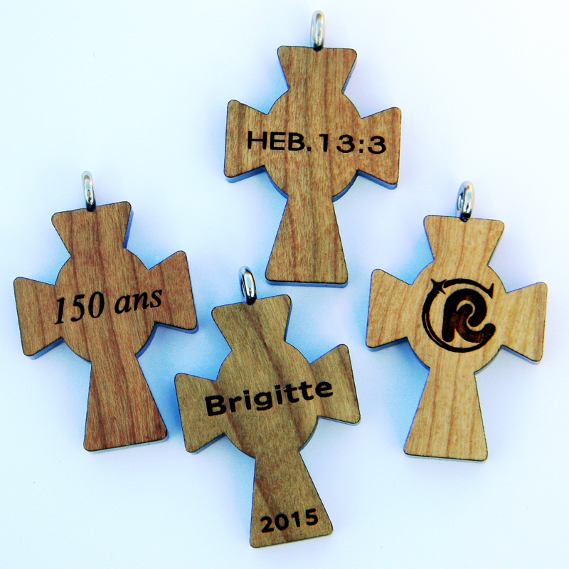 Le bois de la croix est du cerisier, taillé et gravé au laser. La symbole est gravé sur un ovale en érable et collé à la main.